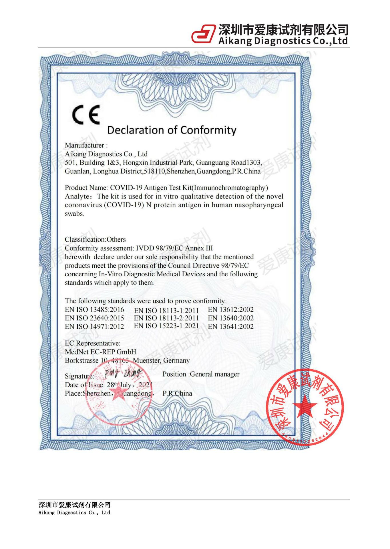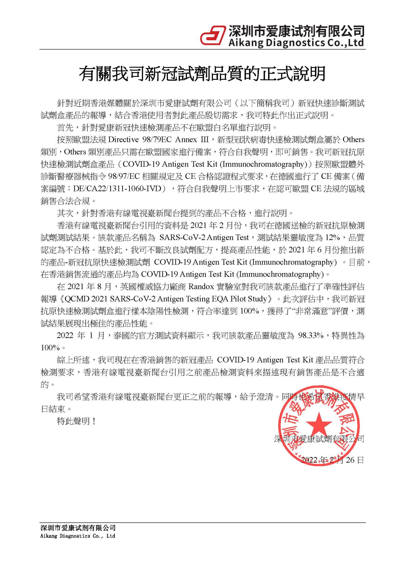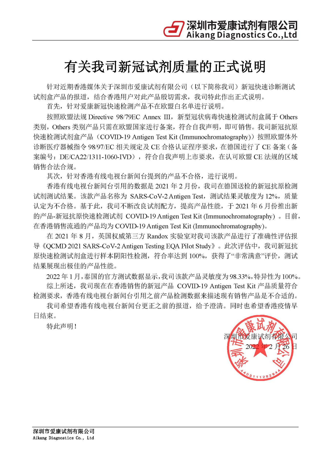 有关我司新冠试剂质量的正式说明